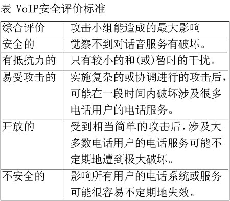 測試結(jié)果表明,采用了復(fù)雜攻擊手段的攻擊小組無法破壞思科公司的VoIP網(wǎng)絡(luò),甚至無法對其造成顯著的干擾。這套精心制造的IP電話系統(tǒng)(包括第二層和第三層基礎(chǔ)設(shè)施以及各式各樣的附加安全軟件)是“安全的”(參見表中所示的VoIP安全評價(jià)標(biāo)準(zhǔn)),它最大限度地全面發(fā)揮了思科公司的網(wǎng)絡(luò)安全專長,利用了思科公司擁有的每一種防御武器。