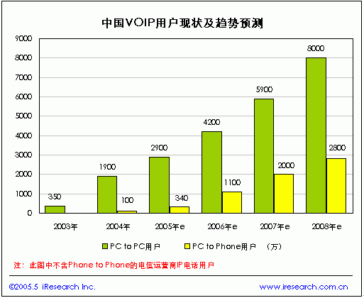 中國VOIP市場上PC to PC的VOIP電話主要是通過即時通訊軟件和語音聊天室來實現(xiàn)的,目前這部分服務(wù)絕大多數(shù)是免費的,尚未給服務(wù)公司帶來直接的經(jīng)濟收入。根據(jù)iResearch的統(tǒng)計數(shù)據(jù),2004年中國PC to PC的VOIP電話用戶達到1900萬,2005年有望達到2900萬。由于信息產(chǎn)業(yè)部在2003年2月發(fā)布的《電信業(yè)務(wù)分類目錄》中規(guī)定IP電話屬于第一類基礎(chǔ)電信業(yè)務(wù),但“IP電話業(yè)務(wù)在此特指由電話網(wǎng)絡(luò)和IP網(wǎng)絡(luò)共同提供的Phone-Phone以及PC-Phone的電話業(yè)務(wù)”,這與目前虛擬運營的Phone to Phone 、PC to Phone的寬帶電話略有不同,盡管如此這一規(guī)定對提供Phone to Phone 和PC to Phone的非電信運營商有著非常大的制約,目前在我國提供“到電話”的VOIP服務(wù)除部分基礎(chǔ)電信運營商試驗外多為暗中操作,存在較大的風險不能通過大規(guī)模的市場推廣來迅速吸引用戶,因此PC to Phone的VOIP電話用戶增長速度將相對平穩(wěn),據(jù)iResearch預測,2008年中國的PC to Phone的VOIP電話用戶將達到2800萬戶。