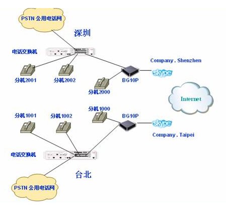 當臺北辦公室的一個員工(分機 1001)想與深圳辦公室的一個員工(分機2001)通話,他(她)撥打1000號分機,臺北側(cè)的ITA將該PSTN呼叫Forward到深圳的Skype(Company.
