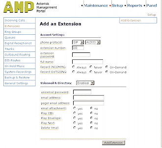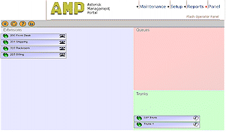 在AMP中,有四個(gè)主要的部分――維護(hù)、設(shè)置、報(bào)告和面板。我們還沒(méi)開(kāi)始進(jìn)行設(shè)置呢,則設(shè)置標(biāo)簽是我們要最先來(lái)訪問(wèn)的,它的主要功能是維護(hù)管理呼入和呼出,包括設(shè)置中繼、數(shù)字話務(wù)員、語(yǔ)音信箱,甚至還可處理響鈴后播放的音樂(lè)(類(lèi)似于現(xiàn)在手機(jī)上的彩鈴噢)。