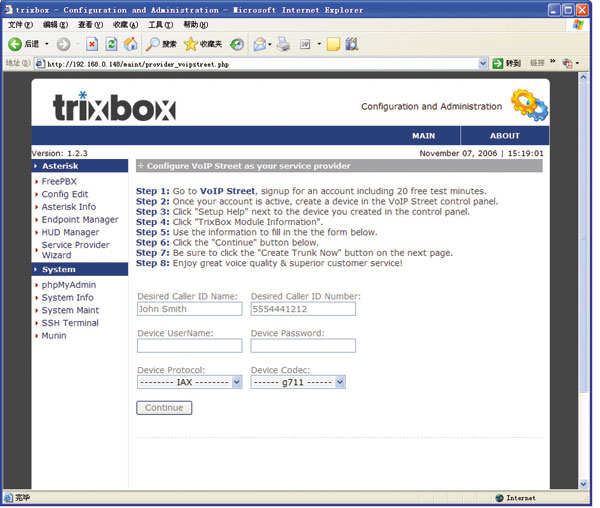 以往,我們使用一臺基于FreeBSD和Asterisk 1.2.4的PC機完成這個功能,在測試過程中,我們使用Trixbox,經(jīng)過簡單配置,很快就實現(xiàn)了原有功能。