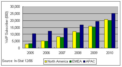 應該說在2006年,VoIP技術已經(jīng)不是阻礙其市場發(fā)展的主要因素,因為In-Stat在全球個人VoIP消費市場中作的調(diào)查顯示,約9%的VoIP用戶甚至不清楚自己在使用IP傳輸;有64%的用戶在使用免費的VoIP服務。其次有超過73%的用戶并不把是否使用IP技術當成選擇該業(yè)務的影響因素。而寬帶接入市場的競爭則構(gòu)成了VoIP發(fā)展的關鍵因素,作為一種寬帶應用,誰的接入資源占據(jù)了用戶家庭,誰就可以決定是否采用VoIP技術來提供語音業(yè)務。在歐洲法國Free Telecom與意大利的FastWeb都是三重播放業(yè)務的積極推進者,在VoIP市場居領先地位;在日本Yahoo!BB擁有亞洲地區(qū)50%的寬帶VoIP用戶。幾乎所有這些寬帶ISP提供商往往采用包月的形式或者以極低的費用提供無限制的本地或國內(nèi)通話,在國際長途電話上提供極大的折扣。