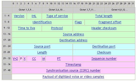 根據IETF的標準建議,通過IP網絡傳輸語音信號樣本需要增加三個額外的報頭,每個報頭對應一個網絡層次,即IP,UDP和RTP [4]。