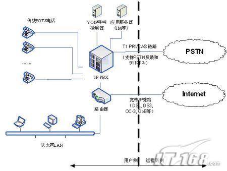 圖2顯示了從傳統(tǒng)的中央交換機業(yè)務向基于IP的中央交換機業(yè)務轉換的一個具有可行性的解決方案體系結構,這個方案盡量使得用戶側客戶端對于基礎設施的投資最小化,而運營商對此的投資回報則會相對較多(Internet服務提供商,ISP相對較少,而電信運營商更多)。更具體來講,部署成本取決于設備接口和服務的需求、部署的范圍、備的使用年限、現(xiàn)有可用的IP網絡基礎設施等等,因此每個具體的解決方案需要單獨地核算成本。