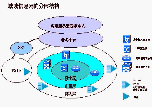 寬帶IP城域網(wǎng)作為互聯(lián)網(wǎng)在城市的延伸,網(wǎng)絡(luò)骨干節(jié)點之間以千兆帶寬互聯(lián),為各種基于IP的數(shù)據(jù)業(yè)務(wù)和網(wǎng)絡(luò)應(yīng)用提供靈活高效的支持。同時也為用戶提供包括高速專線接入、10M/100M寬帶接入、ADSL接入等在內(nèi)的各種類型接入手段,一次性解決了全網(wǎng)及用戶端的網(wǎng)絡(luò)帶寬瓶頸。