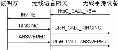 當(dāng)用戶通過無線手持設(shè)備撥打一個(gè)號碼時(shí),無線手持設(shè)備將發(fā)送一個(gè)HtoG_CALL_ NEW的內(nèi)部會(huì)話信令連同呼叫的號碼給無線語音網(wǎng)關(guān),無線語音網(wǎng)關(guān)收到該信令后,將根據(jù)該信令構(gòu)造相應(yīng)的SIP消息并發(fā)送到外部網(wǎng)絡(luò)。當(dāng)無線語音網(wǎng)關(guān)收到來自被叫方表示振鈴信息的暫時(shí)應(yīng)答RINGING時(shí),將發(fā)送一個(gè)GtoH_CALL_RINGING的內(nèi)部會(huì)話信令給手持設(shè)備。當(dāng)無線語音網(wǎng)關(guān)收到來自被叫方表示應(yīng)答的信息ANSWERED時(shí),語音網(wǎng)關(guān)將啟動(dòng)RTP線程并發(fā)送一個(gè)GtoH_CALL_ANSWERED的內(nèi)部會(huì)話信令給手持設(shè)備以通知被叫方已應(yīng)答。此時(shí)手持設(shè)備開啟語音進(jìn)程,與被叫方實(shí)現(xiàn)通話。