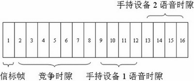 根據(jù)設(shè)計(jì)的特點(diǎn),無線語音網(wǎng)關(guān)同手持設(shè)備間的無線網(wǎng)絡(luò)采用星型拓?fù)浣Y(jié)構(gòu),無線語音網(wǎng)關(guān)作為無線個(gè)域網(wǎng)的協(xié)調(diào)器同手持設(shè)備進(jìn)行信息交互。IEEE802.15.4MAC層分為使用信標(biāo)幀和不使用信標(biāo)幀兩種工作模式,本設(shè)計(jì)采用使用信標(biāo)幀同步的超幀結(jié)構(gòu),由無線語音網(wǎng)關(guān)發(fā)送信標(biāo)幀同步無線手持設(shè)備的數(shù)據(jù)傳輸。本設(shè)計(jì)中超幀長30ms,等分為16個(gè)時(shí)隙,每個(gè)時(shí)隙為1.875ms。信標(biāo)幀在時(shí)隙1發(fā)送,時(shí)隙2到時(shí)隙8為競爭時(shí)隙,使用時(shí)隙CSMA-CA算法傳輸命令幀和應(yīng)答幀。時(shí)隙9到時(shí)隙16固定分配給兩個(gè)手持設(shè)備作為上下行語音數(shù)據(jù)通道。上下行各兩個(gè)時(shí)隙的分配可以滿足經(jīng)