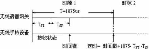 時(shí)隙1開始后,語音網(wǎng)關(guān)需要TSTms的時(shí)間將射頻芯片從空閑狀態(tài)轉(zhuǎn)換為發(fā)送狀態(tài),當(dāng)轉(zhuǎn)換為發(fā)送狀態(tài)后,預(yù)先存儲在射頻芯片發(fā)送RAM中的信標(biāo)幀立即開始發(fā)送,手持設(shè)備上的射頻芯片在收到六個(gè)字節(jié)TSPms后自動(dòng)鎖存一個(gè)當(dāng)前時(shí)間timestamp(時(shí)間戳),