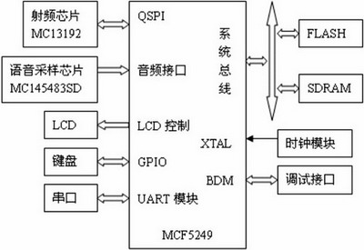 除內(nèi)核外,完整的操作系統(tǒng)還需要編寫鍵盤,LCD,音頻驅(qū)動(dòng)和射頻芯片驅(qū)動(dòng)。音頻驅(qū)動(dòng)采用Phlips I2S數(shù)據(jù)格式,設(shè)定采樣率為8KHz。射頻芯片驅(qū)動(dòng)采用Freescale公司為MC13192提供的配套軟件模塊。