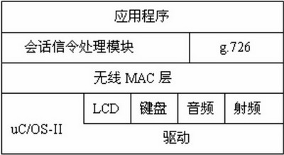 操作系統(tǒng)之上是無線MAC層,該模塊針對語音無線傳輸?shù)奶攸c(diǎn)簡化實(shí)現(xiàn)了IEEE 802.15.4 協(xié)議MAC層功能。第三層為語音壓縮編解碼g.726模塊和無線網(wǎng)內(nèi)部會(huì)話信令處理模塊。會(huì)話信令處理模塊負(fù)責(zé)處理來自無線語音網(wǎng)關(guān)的會(huì)話信令。最上層為應(yīng)用層,實(shí)現(xiàn)用戶界面和通話過程控制。無線手持設(shè)備總統(tǒng)框架如圖6所示。