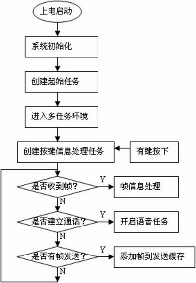 當(dāng)手持設(shè)備上電啟動(dòng)后,其工作流程如圖7示。首先進(jìn)行的是系統(tǒng)的初始化,包括處理器初始化,操作系統(tǒng)mC/OS-II初始化,LCD,鍵盤,射頻模塊等的初始化。之后建立起始任務(wù)并通過OSStart()函數(shù)進(jìn)入多任務(wù)環(huán)境。此時(shí)起始任務(wù)占用CPU資源,在起始任務(wù)中,建立按鍵信息處理任務(wù)并通過信號量機(jī)制掛起。然后判斷是否收到來自無線語音網(wǎng)關(guān)的幀,如果有,調(diào)用frame_deal()函數(shù)處理幀信息,在該函數(shù)中調(diào)用call_command_deal()完成無線網(wǎng)內(nèi)部會(huì)話信令的處理。接著判斷通話是否建立,如果建立則創(chuàng)建語音任務(wù),在語音進(jìn)程中使能PCM編解碼芯片,并進(jìn)行g(shù).726壓縮編碼。最后判斷是否有幀需要發(fā)送給無線語音網(wǎng)關(guān),如果有則把幀添加到發(fā)送緩存,等待發(fā)送時(shí)隙到來。這一過程完成以后重新跳到判斷是否收到來自無線語音網(wǎng)關(guān)的幀,重復(fù)以上過程。如果有鍵盤中斷,將會(huì)釋放一個(gè)信號量,該信號量將解掛按鍵信息處理任務(wù)。該任務(wù)對鍵盤輸入信息進(jìn)行處理。