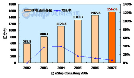 從圖中可以看出,國內IP電話市場近年呈現出快速增長趨勢,2002-2007年年均增長率為20.7%。預計2007年IP電話的通話時長將達到1567.6億分鐘,同比增長7%。但從2005年開始,IP電話的增長率呈下降趨勢,這主要是受管制限制和移動長途的替代作用所致。