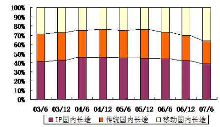 從圖中可以看出,IP電話的相對快速增長在一定程度上對傳統(tǒng)長途電話形成了替代作用,但近年來自于移動長途的替代作用更明顯。從占比上來看,2007年上半年,IP國內長途電話占全部國內長途通話量38.3%,超過移動長途電話的35.9%和傳統(tǒng)長途電話的25.8%,仍然是長途電話的主流。