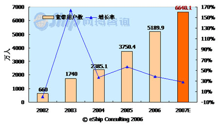 從圖中可以看出,中國的寬帶用戶數保持了快速的發(fā)展勢頭,從2002-2007年年均增長率為58.7%,至2007年,國內的寬帶用戶數將達到6640.1萬。