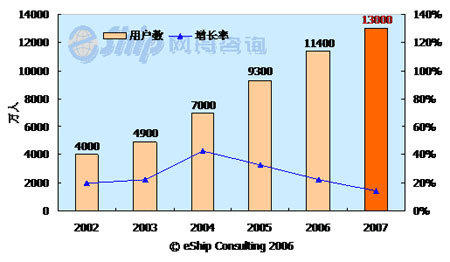 從圖中可以看出,國內即時通訊用戶數保持了較快的發(fā)展速度,從2002-2006年年均增長率為26.6%,到2007年國內即時通訊用戶數將達到1.3億。