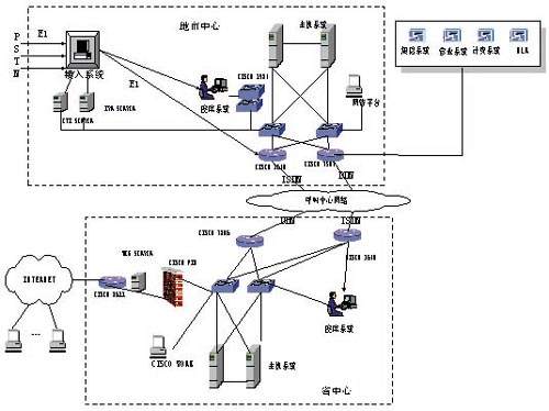 1924和中心交換機互聯(lián);在廣域網(wǎng)上,各地市和省中心通過2M DDN線路實現(xiàn)互聯(lián),通過ISDN線路實現(xiàn)線路備份,考慮到WEB受理的需要,全省呼叫中心系統(tǒng)設置統(tǒng)一的WEB服務器,設在省中心,通過CISCO