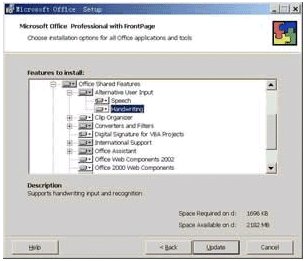 如果是首次使用手寫識別,那么需要通過執(zhí)行自定義安裝來安裝本功能。注意無法從"工具"中找到類似"語音"的"手寫"命令,你只能通過插入Office XP光盤的方法進(jìn)行自定義安裝,其安裝步驟與安裝自定義安裝語音識別功能一致,不過這次是從"Office 共享功能"旁,單擊"中文可選用戶輸入方式"旁,單擊"手寫輸入"(如圖15所示)。