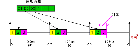TDM就是時分復用模式。它把若干不同通道(Channel)的數(shù)據(jù)按照固定位置分配時隙(TimeSlot:8Bit數(shù)據(jù))合在一定速率的通路(Path)上。每一個時隙的速率為一個標準的PCM(Pulse-Code-Modulation)話路64Kbps。每通道時隙的重復頻率為Ts=8KHz,即幀周期為125us。如圖2所示。通常把若干通話復用在一起以后的通路組稱為一個基本群路,然后更大的通路均在此基礎上進一步復用(4倍)為高次群。其中的時隙數(shù)即復用的通道數(shù)與時鐘有關。國際上有兩個不同的基群標準(PRI:Primary Rate Interface)。美國和日本采用24支路標準,我國采用歐洲標準,使用32路標準,分別記為: