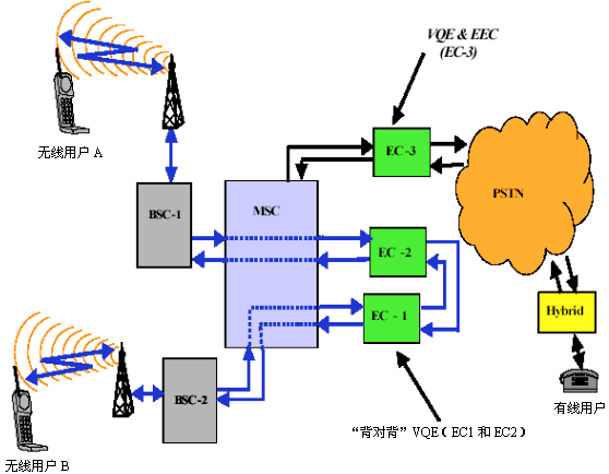 GSM實施了A-Interface(空中接口)體系結構。在圖1中,給出了部署A-Interface戰(zhàn)略的通用GSM網絡配置。如圖所示,這種拓撲方案在A-Interface上采用了VQE(EC-1和EC-2)功能,在PSTN接口處僅采用了EEC(EC-3)功能。這種方案給出了一種技術出眾的格局。EC-3組件消除了源自"PSTN到移動"呼叫所致的電氣(混合)回聲,而EC-1和EC-2部件則在每一次的"移動對移動"以及"移動到PSTN"呼叫上提供了VQE(語音質量增強)功能。