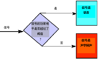 聲學(xué)回聲的一般頻譜特征類似于語(yǔ)音的頻譜特征。類似地,聲學(xué)回聲路徑中的非線性特征會(huì)引起回聲和原始語(yǔ)音音節(jié)之間的不一致。因此,有效語(yǔ)音和對(duì)應(yīng)的聲學(xué)回聲之間的電平差異(振幅差異)提供了相應(yīng)的信息,使用該類信息,可將聲學(xué)回聲從主流語(yǔ)音中分離出來。在圖4中,給出了識(shí)別某一信號(hào)是有效信號(hào)還是聲學(xué)回聲信號(hào)所采用的邏輯方法的概念視圖。