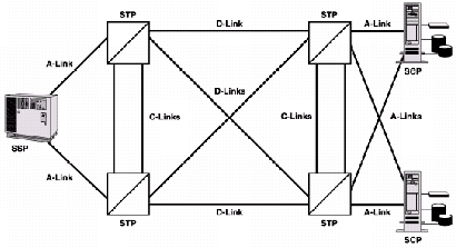 SS7提供消息傳遞以實現(xiàn)正確無誤的業(yè)務功能,如呼叫建立。因此,SS7被設計成能達到相當高的可靠性。可靠性來自鏈路的多樣性和冗余備份。圖4說明了一個簡單SS7網(wǎng)絡的標準例子,著重說明了一些內(nèi)建的可靠性特征,比如鏈路的網(wǎng)狀配置,這樣使得網(wǎng)絡中的每個信令點間都有冗余備份的鏈路,從而提高了整個網(wǎng)絡的可靠性。