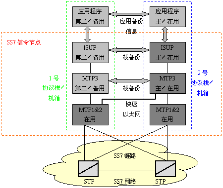 只有SS7鏈路出現(xiàn)故障時,SS7協(xié)議才有相應的規(guī)則去處理故障,對其它故障的處理必須在設計SS7平臺和整個系統(tǒng)結構時予以考慮。還有一個普遍的要求是:軟件的升級過程中不能影響整個系統(tǒng)的運行。能達到以上要求的一個解決方案是:使用兩個主機箱,在每個主機箱里插有SS7接口板,用于支持一條或多條SS7鏈路。讓兩個主機都使用一個SS7地址,也就是共用一個信令點編碼,這樣遠端的交換機或STP就會認為這兩個主機是一個完整的系統(tǒng)。這樣,這兩個主機組成的系統(tǒng)就能在其中一個出現(xiàn)故障時仍能正常工作。