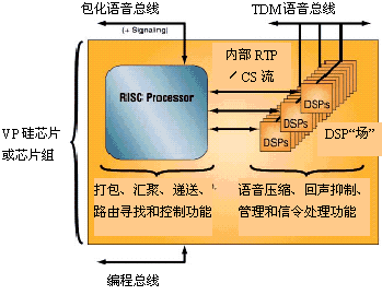 這種新型半導(dǎo)體元件被叫作語音處理器(VP),它不是技術(shù)創(chuàng)新成果,而只是傳統(tǒng)DSP核心和通用RISC處理器在一個或兩個硅片上的重新包裝和集成。DSP核心完成VoP的壓縮、回聲抑制和各種信號處理任務(wù),而RISC處理器完成VoP的匯聚和打包處理。