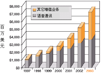 為了獲得競爭優(yōu)勢,業(yè)務提供商──傳統(tǒng)長途運營和本地交換運營商,因特網(wǎng)業(yè)務提供商(ISP),應用業(yè)務提供商,以及無線運營商──都在想方設法發(fā)布基于IP的業(yè)務,這些業(yè)務應該:對用戶有較高的價值,能縮短面市所需時間,部署是低成本高效益的。向用戶提供高價值的增值業(yè)務能為業(yè)務提供商帶來重要的收入源泉,并使他們更有特色,增加市場分額,特別是如果這些業(yè)務以快速、易于支持的方式部署,以上這些優(yōu)勢就會更加突出。據(jù)估計,到2003年增值業(yè)務設備僅在美國就能達到73億美元的市場,正如圖1所示。
