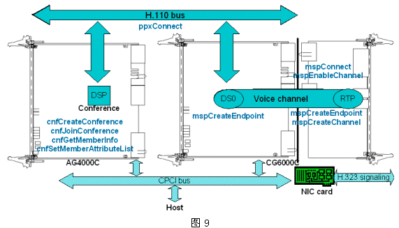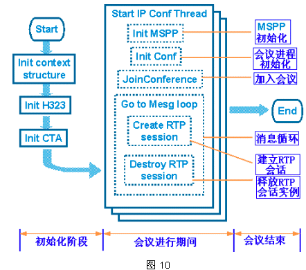 整個(gè)IP會(huì)議大概過(guò)程可以用圖10來(lái)說(shuō)明,各子流程均由MGCP/H.323的相關(guān)API函數(shù)完成。