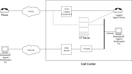 連接到傳統(tǒng)的ACD上. 主叫方的信息例如IP地址, Email地址等被傳送的哦CTI服務(wù)期. CTI服務(wù)期可以用這些信息去客戶數(shù)據(jù)庫中進(jìn)行查詢, 影響到座席代表的路由,