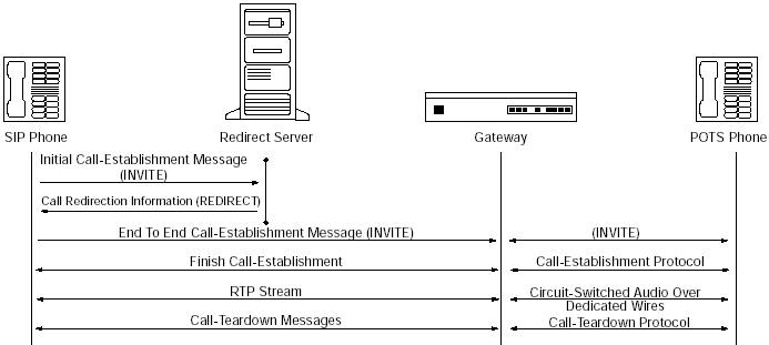 圖5里的重定向服務(wù)器,只處理發(fā)給被叫方的第一個(gè)INVITE消息,并反饋一個(gè)特殊的回應(yīng)給主叫方。主叫方從回應(yīng)中取出一個(gè)新的地址,并給這個(gè)地址發(fā)送INVITE消息。這個(gè)地址可能是真實(shí)的被叫方,代理服務(wù)器或者另一個(gè)重定向服務(wù)器。從這以后,所有消息都直接在主叫方和新的地址之間傳遞。