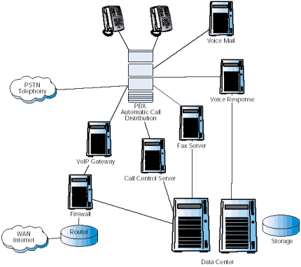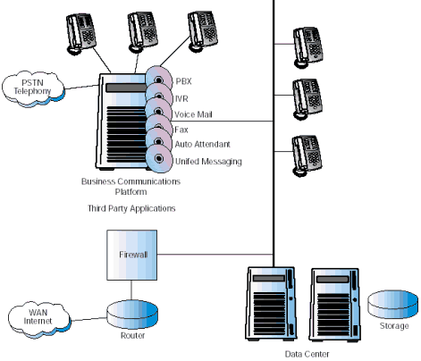 圖1描述了當前一個典型的復(fù)雜的企業(yè)通信系統(tǒng)配置。連接到PSTN的主要部分PBX/KTS,仍然是系統(tǒng)的核心,提供了交換和自動呼叫分配的功能。一系列增加的應(yīng)用通過附屬服務(wù)器連接到PBX/KTS上。很多附屬服務(wù)器也連到數(shù)據(jù)中心上,因為它們需要訪問企業(yè)的數(shù)據(jù)。 使現(xiàn)有情況變得更為復(fù)雜的是,Internet正在變?yōu)椴豢扇鄙俚纳虅?wù)工具,各公司紛紛安裝VoIP以降低網(wǎng)絡(luò)成本,滿足多媒體通信的需要。這些服務(wù)由企業(yè)防火墻后的網(wǎng)關(guān)提供,這個網(wǎng)關(guān)也是連接到PBX/KTS上的。