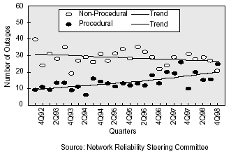 根據(jù)來自網(wǎng)絡(luò)可靠性指導(dǎo)委員會(NRSC)的研究,對于33%報告的業(yè)務(wù)中斷,程序出錯是根本原因。程序中斷的頻率有上升的趨勢,正如在右面圖中顯示的那樣。