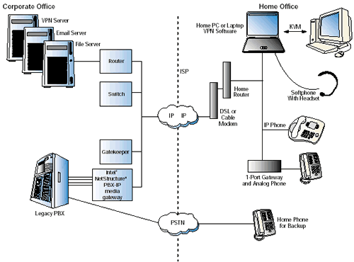 為了實現(xiàn)這個VoIP解決方案,PBX-IP網關連接到了辦公室里的原有的PBX和關鍵系統(tǒng)上,還有網守軟件實現(xiàn)一些呼叫的路由以及地址轉換。然后遠程辦公者連接到了網關上--最終連接到公司PBX上--或者使用IP軟電話,或者一個實際的IP電話,或者一個單端家庭網關連接到模擬耳機上。