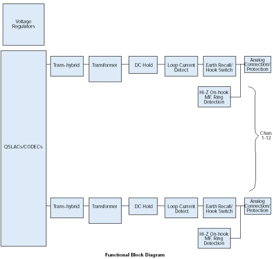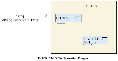 來自12個環(huán)路電話線的信號首先通過電話線路接口連接到D/120JCT-LS板卡上,該接口提供瞬變保護(hù)和電磁干擾(EMI)刪除(參見子板塊圖)。這些電話線路接口使用可靠的晶體摘掛機(jī)開關(guān)(無機(jī)械接觸)和FCC-Part