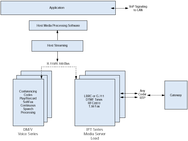 如圖2所示,IPT系列板卡可以通過(guò)H.110總線連接到任何一個(gè)高密度的Dialogic Dialogic DM/V語(yǔ)音系列媒體處理板卡上。開發(fā)商通過(guò)組合IPT系列和DM/V板卡,便可以分發(fā)他們的解決方案,包括語(yǔ)音處理、傳真、講話以及會(huì)議功能,這套解決方案可以使每個(gè)系統(tǒng)可以從數(shù)以百計(jì)的端口升級(jí)到數(shù)以千計(jì)的端口。開發(fā)商也可以選擇使用IPT系列板卡作為高密度接口板卡,并連接到PCI總線使其可以訪問(wèn)在主機(jī)處理器上執(zhí)行的媒體處理功能。
