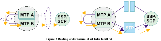 當連接到MTP A或連接到 MTP B的鏈路發(fā)生故障時,消息發(fā)送通過MTP A和MTP B之間的鏈路發(fā)送到另一個MTP,并在可用的鏈路上發(fā)送,如圖3。