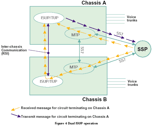 一個雙ISUP/TUP系統(tǒng)通過激活每個機箱中的一半電路協(xié)議狀態(tài)機進行工作。每個ISUP/TUP層通過本地MTP3發(fā)送所有的傳送業(yè)務(wù)。本地MTP3采用與相鄰SS7節(jié)點之間的本地鏈路進行傳輸,如果該鏈路發(fā)生故障,采用機箱之間的SS7連接。