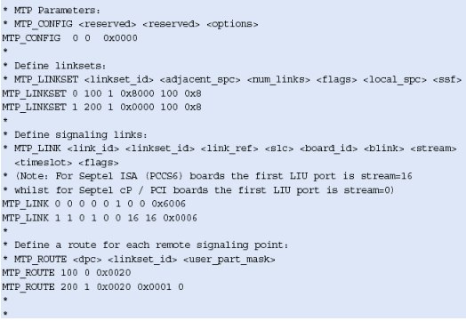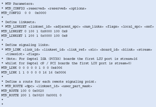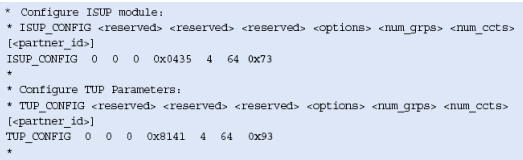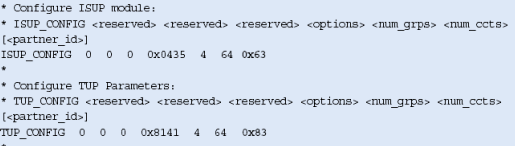 注意,這些不包括任何設(shè)置或定義信令板卡的命令,應(yīng)該象定義標準的單系統(tǒng)一樣定義。MTP_ROUTE <up_enable>參數(shù)為ISUP設(shè)置,在上例中用戶部分SI=5。