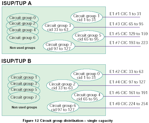兩個系統(tǒng)中的電路組既可以從0開始編號,也可以兩個系統(tǒng)間隔標號。如果使用第一種方法,整個系統(tǒng)的容量就是單ISUP/TUP協(xié)議層系統(tǒng)的容量的2倍,如果使用第二種方法,系統(tǒng)總?cè)萘颗c單ISUP/TUP協(xié)議層系統(tǒng)的容量相同。對于這兩種情況,每半部分控制對立的CIC范圍,如圖11和12所示: