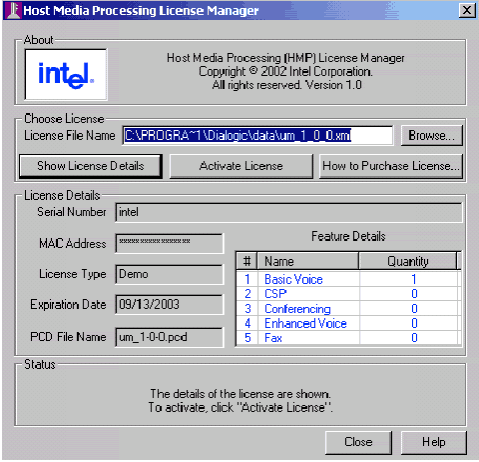 2. 如果HMP許可證管理器GUI沒(méi)有在屏幕上,可通過(guò)開(kāi)始 > 程序> Dialogic HMP 1.0